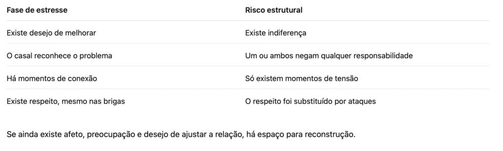 Esses sinais não significam que a separação é inevitável. Significam que a relação precisa de cuidado estruturado.